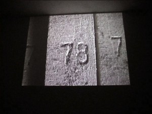 A piano music installation using four speakers and video projection run by computer (max/ nato). The image of grey numbers are those inscribed on the 85 wooden piano hammers. The corresponding notes have had the percussive attack removed and the sustain/decay extended, radically changing the dominant characteristics of the sound but not losing their piano-ness altogether. What note follows another is randomly determined. The interplay between subjective interpretation and rigorous formalism is an experience both emotional and intellectual.