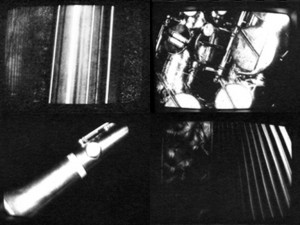 Quartet uses 4 instruments playing 4 notes on 4 monitors, (which each play a different tape in each corner of the room). There is a ‘system’ of orchestrating, somewhere between between sound and music. First shown at Video Positive Liverpool. There is also a single screen version.